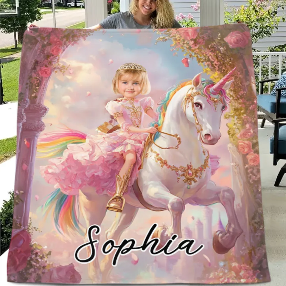 Customized Unicorn Princess Blanket - Personalized Name and Photo Soft Flannel Blanket - A Gift For Daughters, Girls